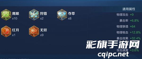 3、第一套铭文:9无双+1红月、2狩猎+8夺萃、10鹰眼