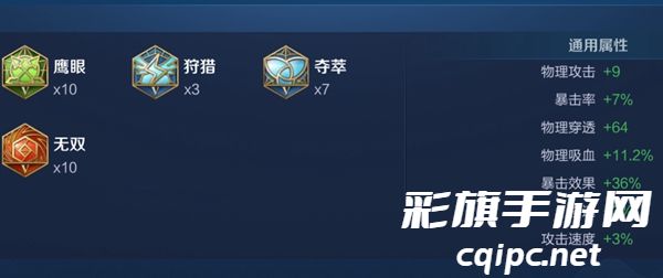 4、第二套铭文搭配:10无双、3狩猎+7夺萃、10鹰眼