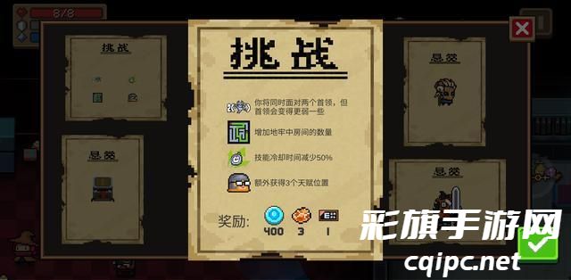 当小编看见今日的挑战因子,就认为机会来了。两个boss,地牢房间增加,技能CD减半,另外三个天赋位置。