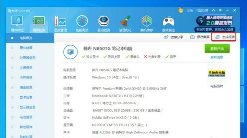 1、打开鲁大师,点击“硬件测试”,点击右上角的“生成报表”按钮。