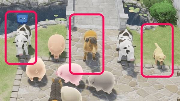 依次与左侧的奶牛、马和狗对话。