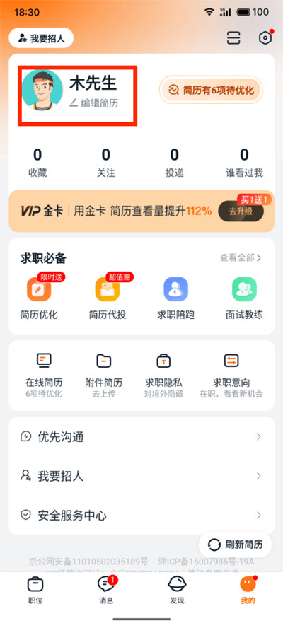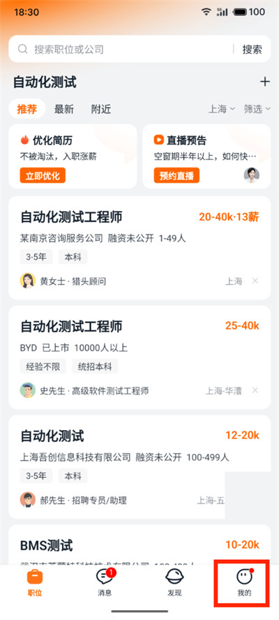 1、打开猎聘软件,进入软件后点击界面右下角【我的】。
