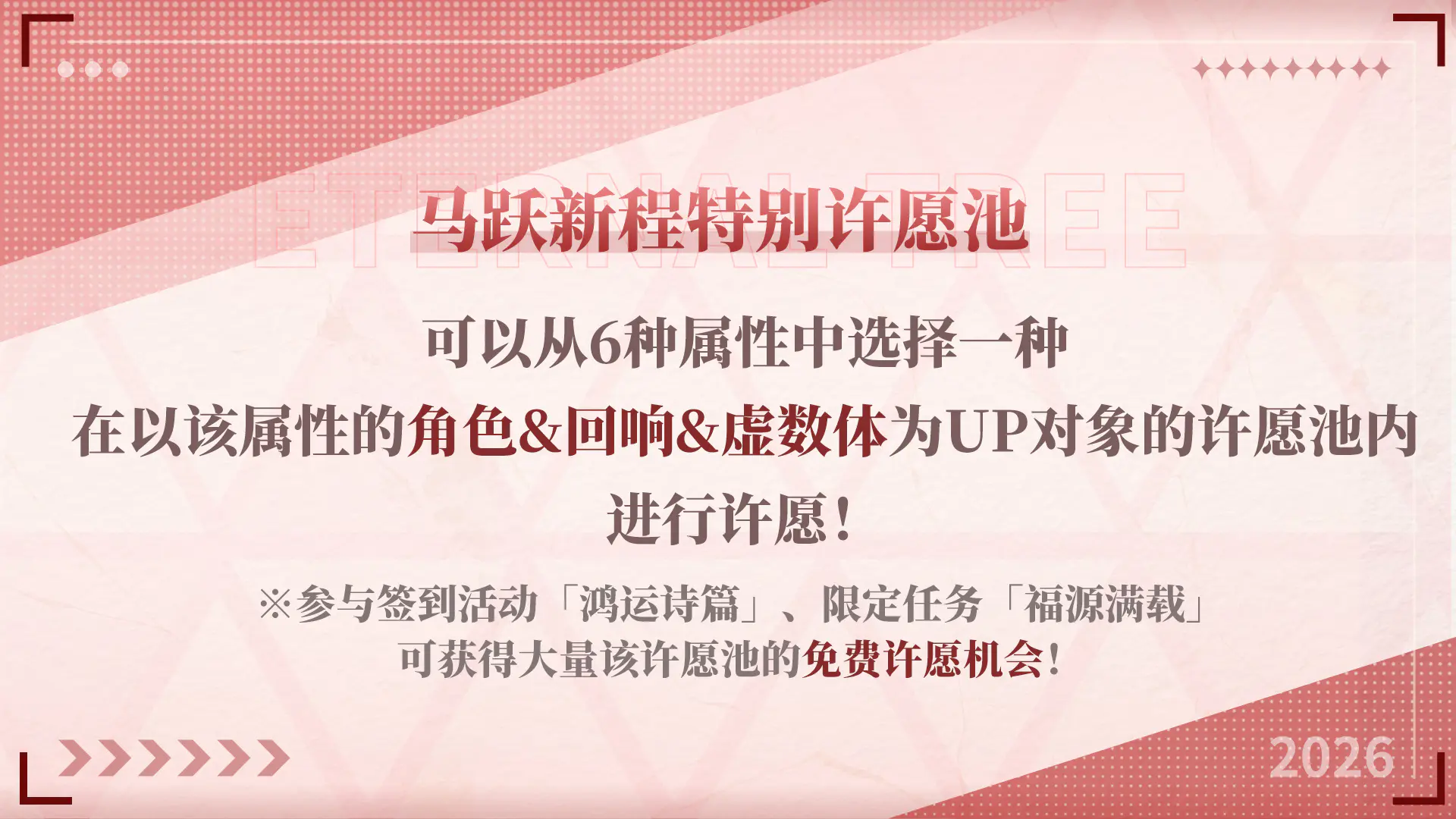 2026马跃新程特别许愿池开放中!探求者大人们可从6种属性中选择一种,在以该属性的角色&回响&虚数体为UP对象的许愿池内进行许愿!