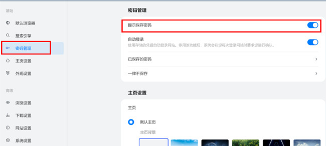 3、在打开的窗口界面中,点击左侧中的"密码管理"选项,然后找到右侧中的"提示保存密码",将其开关按钮打开。