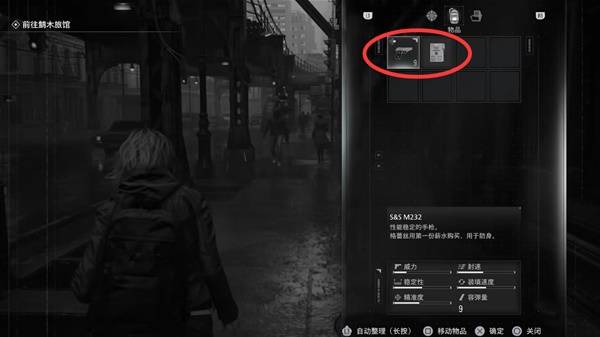 剧情后来到鹪木市的大街上,打开物品栏,看到武器S&S M232手枪、【文件1/75】调查报告。调查报告可以展开阅读。