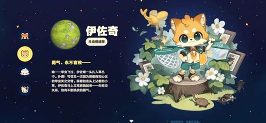 他的外观同样是拟人化的动物形象,是一只充满活力的浅黄色狐狸。他通常穿着清爽的蓝绿色运动套装,肩上经常扛着一把捕虫网,随时随地都能进入捕虫模式。伊佐奇的职业是斗虫训练师,性格乐观,对捕捉甲虫和培育斗虫有着自己独特的技巧。当玩家在星布谷地中遇到稀有难捕的甲虫时,可以向伊佐奇学习捕捉技巧。在游戏前期,他也会引导玩家了解各类昆虫的捕捉方法。后期,与伊佐奇的互动还能逐步解锁昆虫收集、斗虫比赛等特色活动。玩家与他互动时,不仅能学到实用的捕虫技巧,还能听到他分享自己捕捉甲虫的有趣经历。