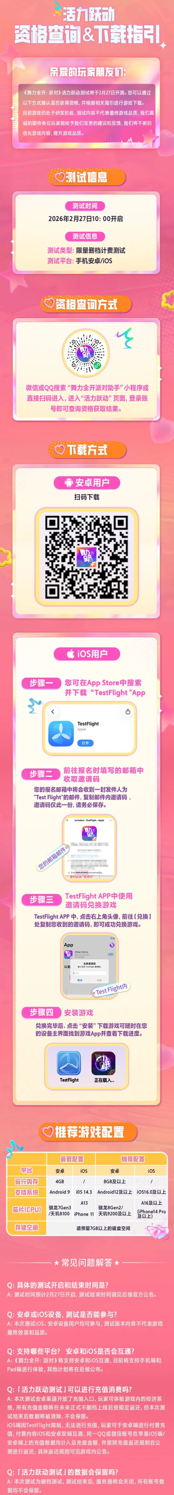 《舞力全开派对》活力跃动测试在2026年2月27日(今日)上午10点正式开启,舞台加载进度100%!是时候再次点亮聚光灯了!获得测试资格的玩家现已可下载游戏,一起按下派对重启键!下面彩旗小编会带来舞力全开派对活力跃动测试的相关资讯来提供给大家参考吧。