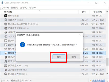 1、在其中选择需要进行删除的软件,右击选择选项列表中的"卸载"。这里以"搜狗输入法 智能助手"为例。