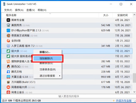 5、如果软件无法正常卸载的话,右击选择选项列表中的"强制删除"。
