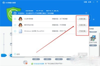 4、弹出一个小窗口,选择需要拦截广告的软件,点击该选项后边的“开启拦截”即可拦截广告,如果是拦截过然后又忽略掉的后边是“恢复拦截”。