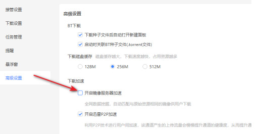 4、找到右侧"下载加速"中的"开启镜像服务器加速",将其小方框勾选上即可。