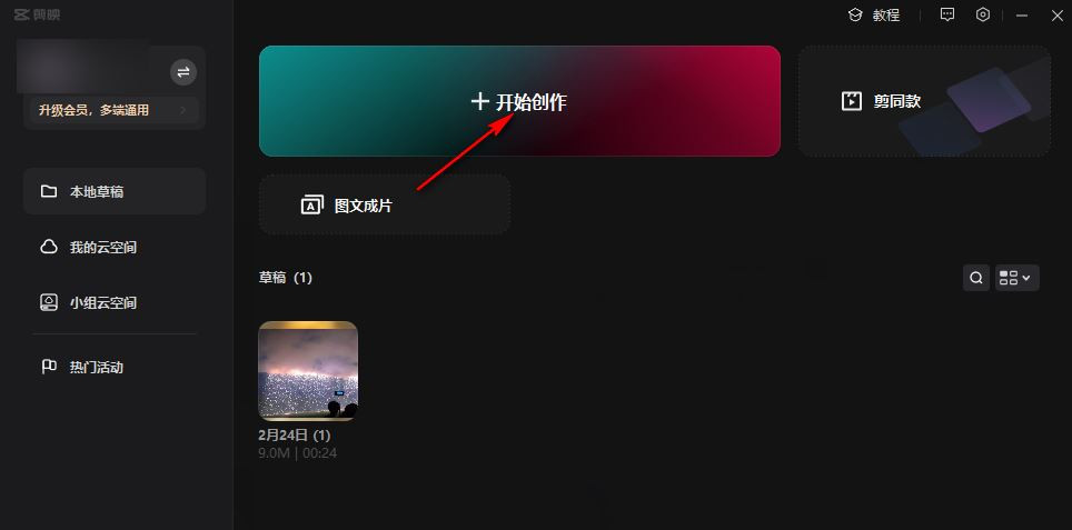 1、在制作之前,需要先准备好两张和自己视频画面一样大小的纯色背景图片,接着打开电脑中的剪映软件,然后在剪映的首页点击“开始创作”选项。