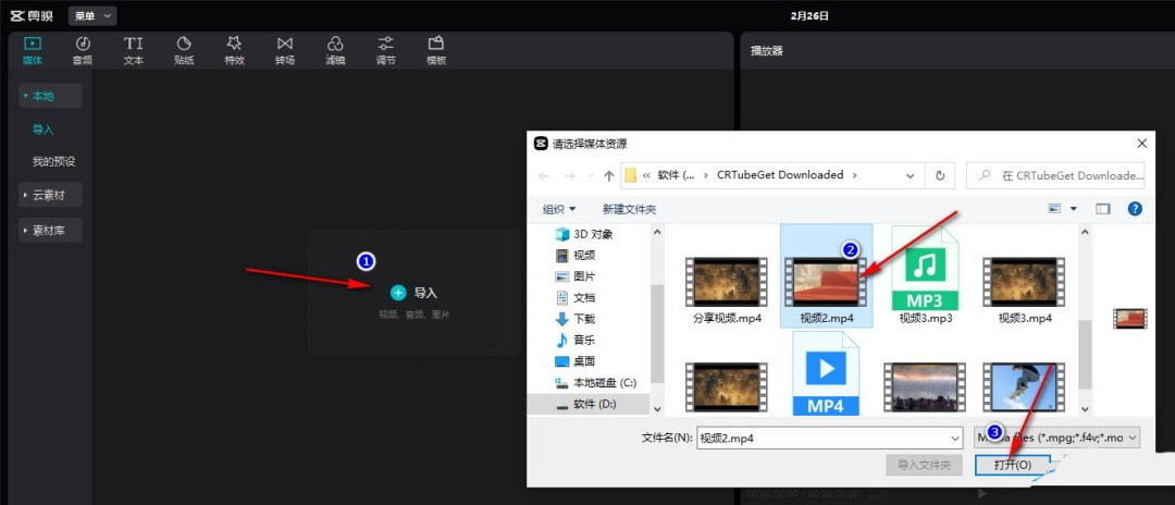 2、进入创作页面之后,先点击“导入”选项,然后在文件夹页面中将自己准备好的素材都添加到剪映中。