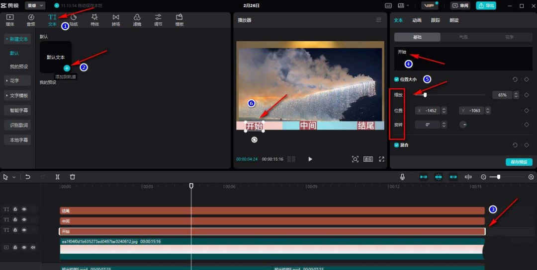 6、在添加文字时,点击“文本”选项,然后可以选择自己喜欢的文字模板,也可以直接使用默认模板,在轨道中将文字轨道拉长到和视频同一长度,然后完成文本内容的编辑以及文字缩放、类型的设置,最后将画面中的文字拖入到进度条中即可。