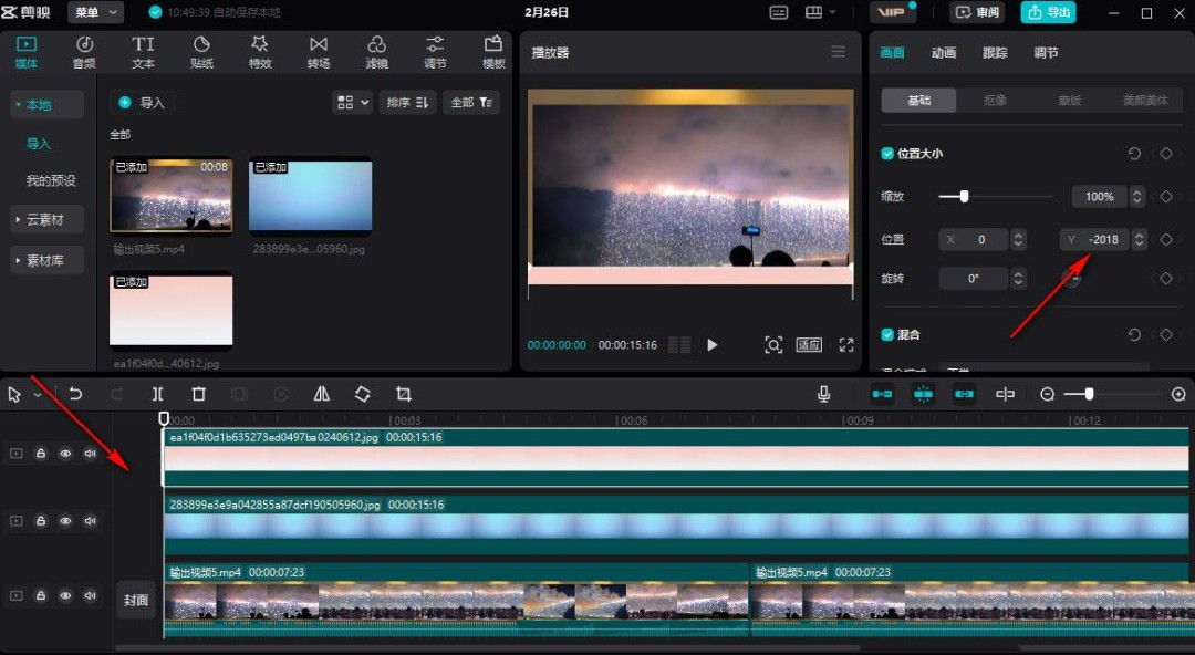 3、添加好素材之后,将素材都拖入轨道中,如图所示让素材都与视频长度一致,然后分别点击两个背景轨道,再在右上角将“Y”改成一样的大小,这里的大小取决于进度条占视频的大小,可以使用世界拖动的方法,在画面中选中纯色背景,将其向下拖动到合适的位置即可。