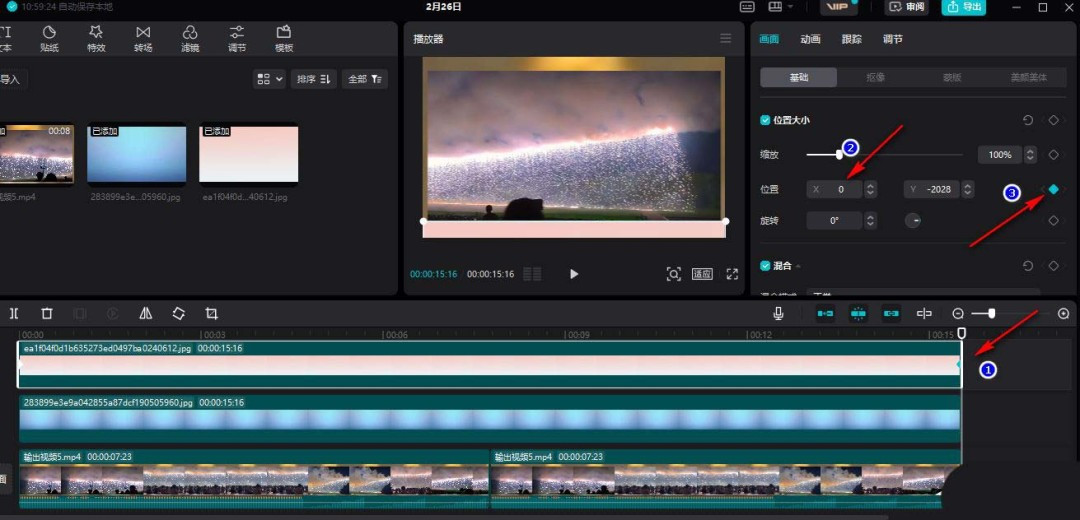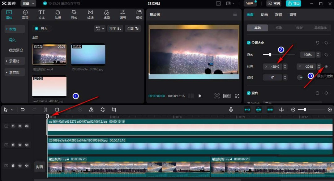 4、点击第一个背景的开头位置,然后在“X处”输入“-3840”,再在右侧点击“添加关键帧”图标,这里的“-3840”,也可以直接拖动背景图片,将其向左移出视频画面即可,需要注意的是需要保持“Y”不变,所以要记住Y的大小,否则上下两个背景图片会出现一高一低的情况。