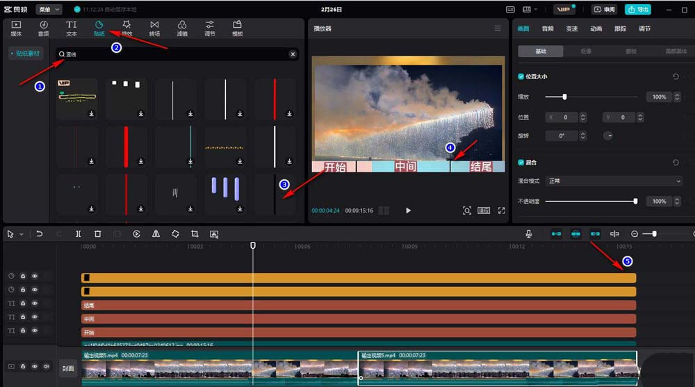 7、添加好文字之后,再点击“贴纸”工具,然后搜索“竖线”,将自己喜欢的竖线类型添加到轨道中,同样拉长长度,然后在画面中将其调整大小并放入进度条区域即可。