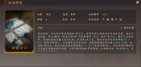 锦囊:在敌方发动战法时有概率为我方武将施加"锦囊",拥有"锦囊"的武将在受到大8%兵力的伤害时,消耗一枚"锦囊"来降低一定的伤害;同时,拥有"锦囊"的武将在造成的伤害超过目标最大兵力的10%,消耗一枚"锦囊"来提本次伤害,"锦囊"效果受智力影响。妙计:在任意武将触发"锦囊"后施加妙计效果,自身对随机一位敌军造成一次谋略伤害。由于诸葛亮战法锦囊的效果和较为亮眼的成长属性,可以让他担任前排主将承伤,在为队伍提供增减伤辅助的同时,还拥有补充伤害的能力。