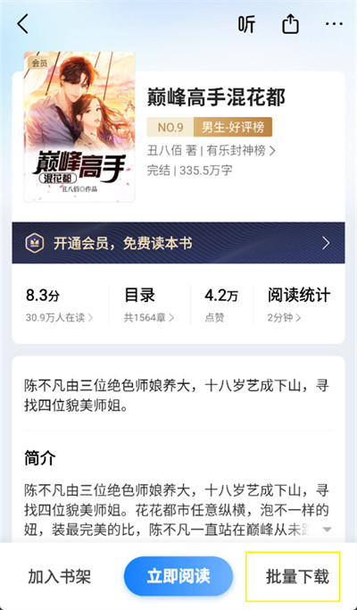 2、进入小说详情界面后,点击界面右下角【批量下载】。