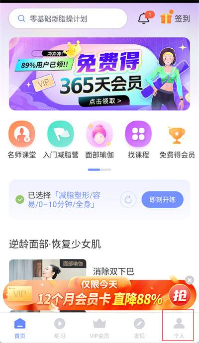 1、开启每日瑜伽软件,进入软件后点击界面右下角【个人】。
