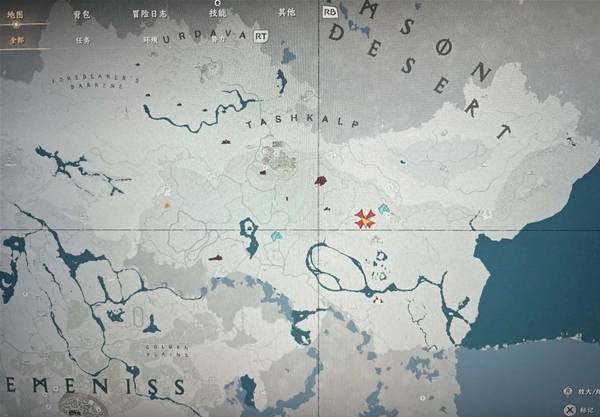 如图所示,红色沙漠这个位置有一个暗巷商人出售世界弓箭制作书第四卷,学习后可以制作一把超帅的虚无者之弓,另外这个商人还售卖纯黑色染料,但是如果我们直接来这里是不会看到他的!要做几个前置任务才能解锁他。