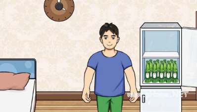 6、拖动背带裤给男生,再点击翻开冰箱,拖动冰箱里的篮球给男生。