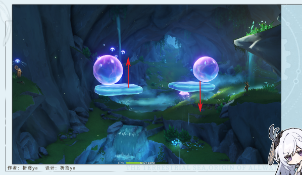 7、当水泡与簧管齐平时(且右边的平台正在下降),玩家可以使用弓箭攻击左边的水泡即可(右边正常会被波纹引爆,没有就补一箭),然后引导第三个仙灵;