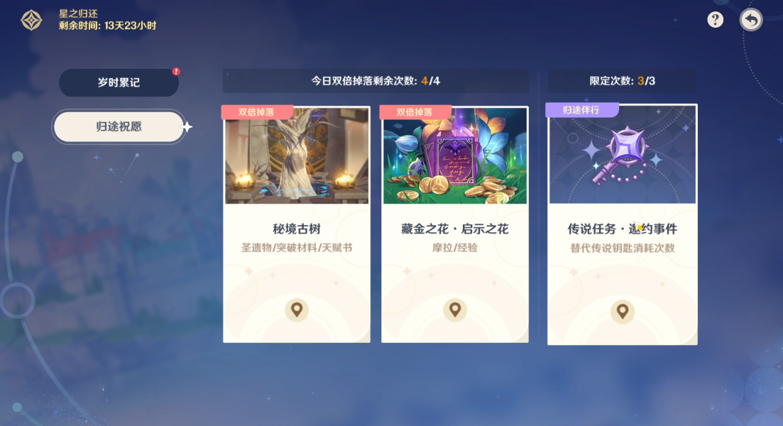 归途要地:根据地图探索度给与一定的奖励,比如开七天神像、探索度达到15%、30%都有奖励