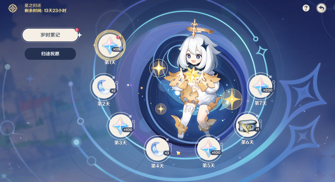 之前回归的7天签到放在了这里,签到总共给500原石,这也是回归奖励能获得的总原石数量