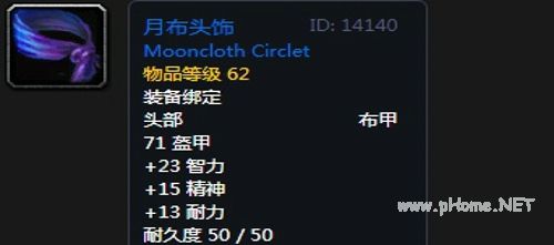 月布头饰:布甲头部,71护甲,+23精神,+15精神,+13耐力。