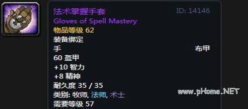 法术掌握手套:布甲手套,60护甲,+10智力,+8精神,装备效果使你的法术造成致命一击的几率提高2%。
