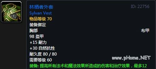 林栖者外套:布甲上衣,98护甲,+15耐力,30自然抗性,装备效果提高所有法术和魔法效果所造成的伤害和治疗效果,最多12点。