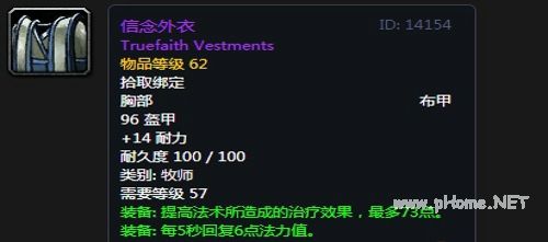 信念外衣:布甲上衣,96护甲,+14耐力,装备效果提高法术所造成的治疗效果,最多73点,每5秒回复6点法力值,使你的消隐技能的冷却时间减少2秒。