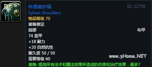 林栖者护肩:布甲肩部,74护甲,18耐力,20自然抗性,装备效果提高所有法术和魔法效果所造成的伤害和治疗效果,最多7点。