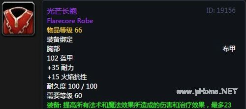 光芒长袍:布甲上衣,102护甲,35耐力,+15火焰抗性,装备效果提高所有法术和魔法效果所造成的伤害和治疗效果,最多23点。