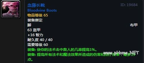 血藤长靴:布甲脚部,63护甲,+16智力,装备效果使你的法术击中敌人的几率提高1%,提高所有法术和魔法效果所造成的伤害和治疗效果,最多19点。