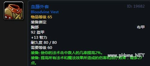 血藤外套:布甲上衣,92护甲,+13智力,装备效果使你的法术击中敌人的几率提高2%,提高所有法术和魔法效果所造成的伤害和治疗效果,最多27点。