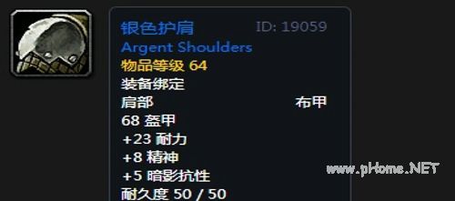 银色护肩:布甲肩部,68护甲,+23耐力,+8精神,+5暗影抗性,无装备效果。