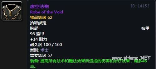 虚空法袍:布甲上衣,96护甲,+14耐力,装备效果 提高所有法术和魔法效果所造成的伤害和治疗效果,最多46点,使用效果为你的宠物回复450to751点生命值,术士专属。