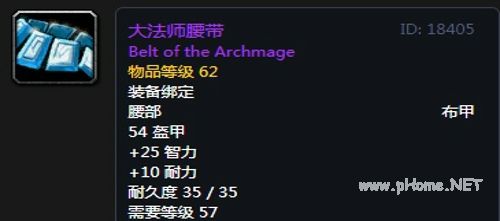 大法师腰带:布甲腰带,54护甲,+25智力,+10耐力,装备效果使你的法术造成致命一击的几率提高1%。