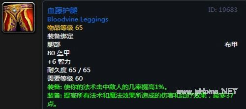 血藤护腿:布甲腿部,80护甲,+6智力,装备效果使你的法术击中敌人的几率提高1%,提高所有法术和魔法效果所造成的伤害和治疗效果,最多37点。