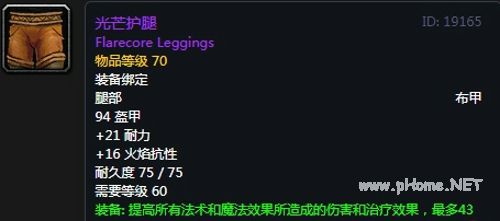 光芒护腿:布甲腿部,94护甲,21耐力,16火焰抗性,装备效果提高所有法术和魔法效果所造成的伤害和治疗效果,最多43点。