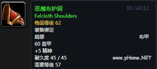 恶魔布护肩:布甲肩部,60护甲,+5精神,装备效果提高暗影法术和效果所造成的伤害,最多26点。