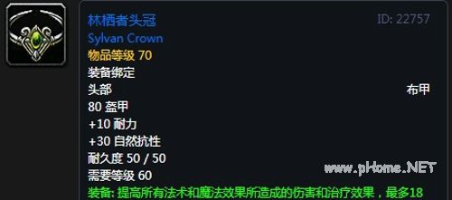 林栖者头冠:布甲头部,80护甲,10耐力,30自然抗性,装备效果提高所有法术和魔法效果所造成的伤害和治疗效果,最多18点。