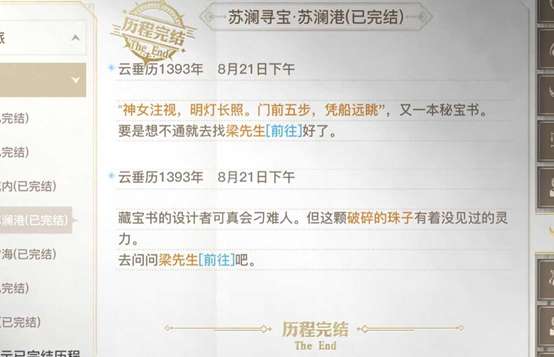 1、首先需要去梁先生处完成神谕星痕任务,获取苏澜港秘宝书;